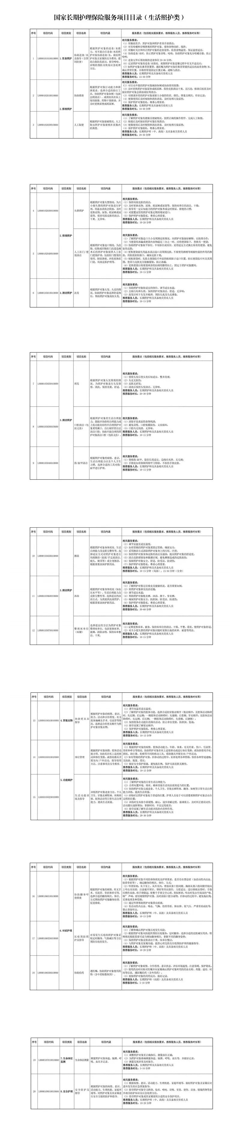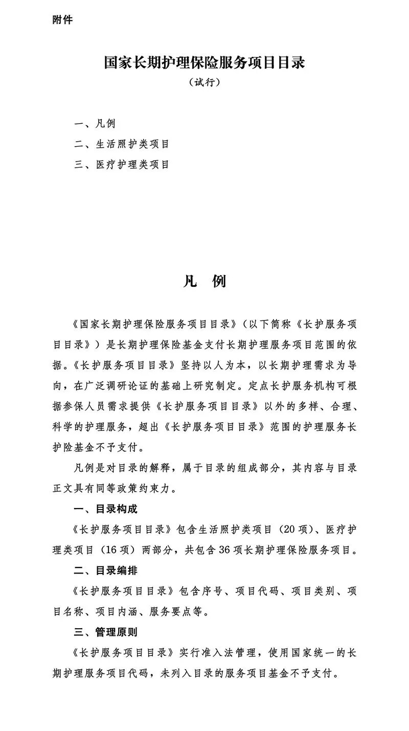 · 《国家长期护理保险服务项目目录(试行)》,对服务项目内涵、基金支付范围等进行统一,明确纳入目录的服务费用,按照规定由长期护理保险基金支付。