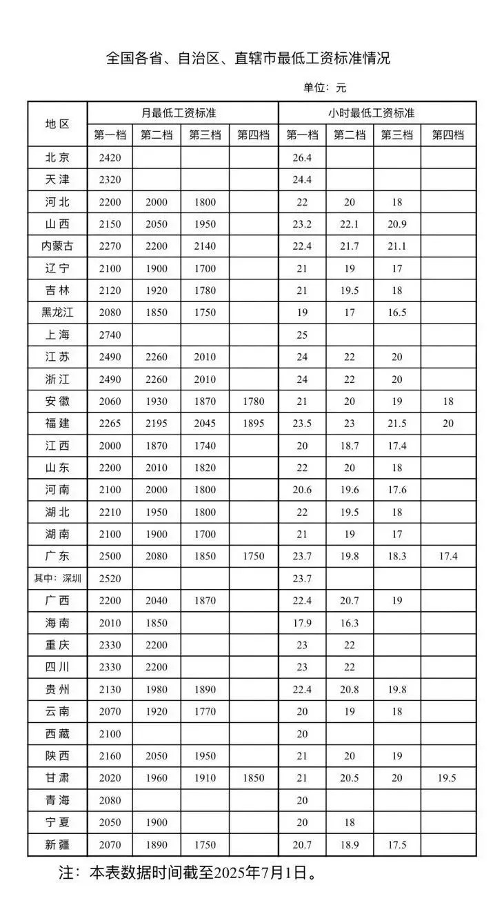 日前,人社部官网公布全国各省、自治区、直辖市最低工资标准情况,截至2025年7月1日。