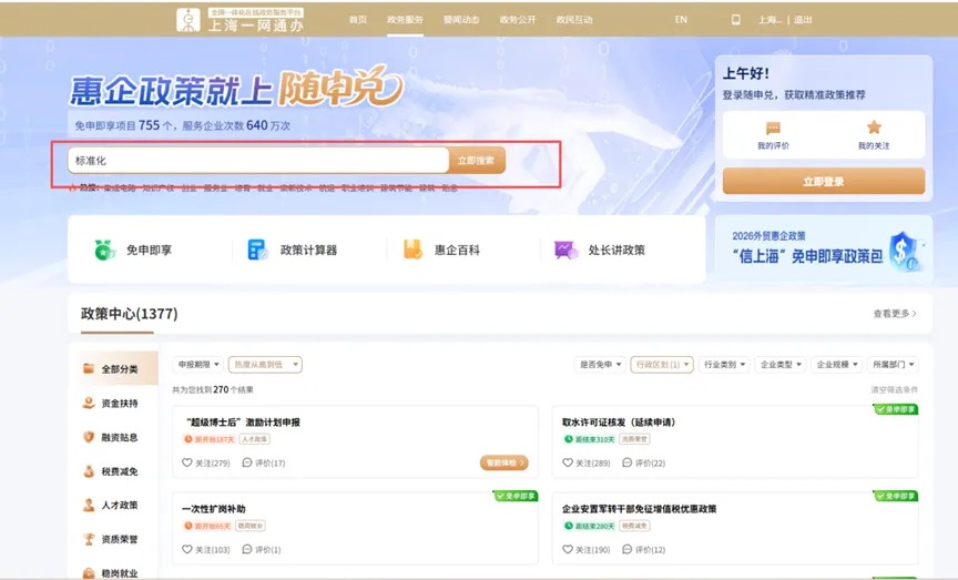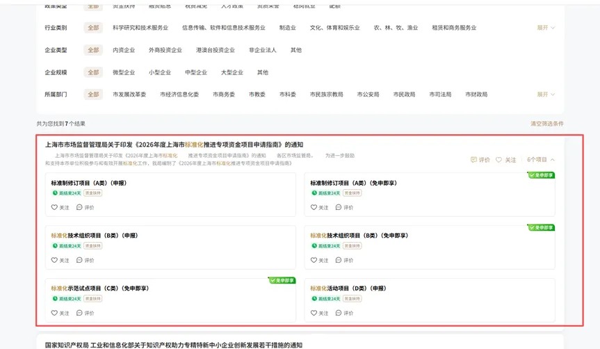 3.搜索框输入“上海市标准化推进专项资金”后立即搜索,选择通知中需要申报的对应项目类别,点击“立即申报”,进行在线填报。