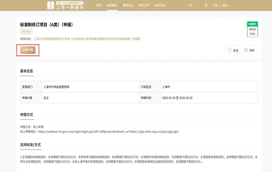 为贯彻《上海市加快打造国际一流营商环境行动方案(2026年)》,加大本市标准化战略的实施,鼓励和支持本市单位积极参与和有效开展标准化工作,近日,市市场监管局正式印发《2026年度上海市标准化推进专项资金项目申请指南》。