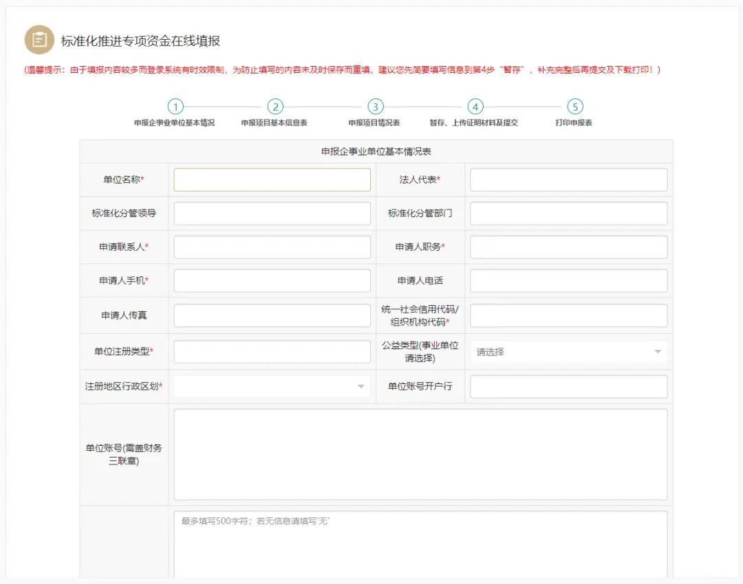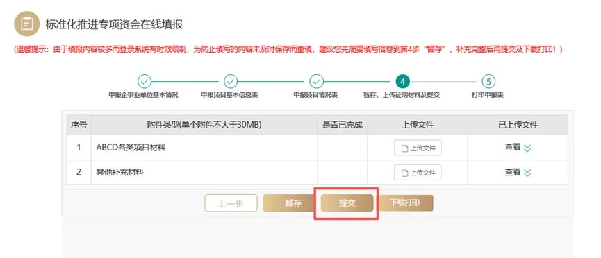 5.按步骤完成在线填报步骤后,点击“暂存”进行保存,或点击“提交”。