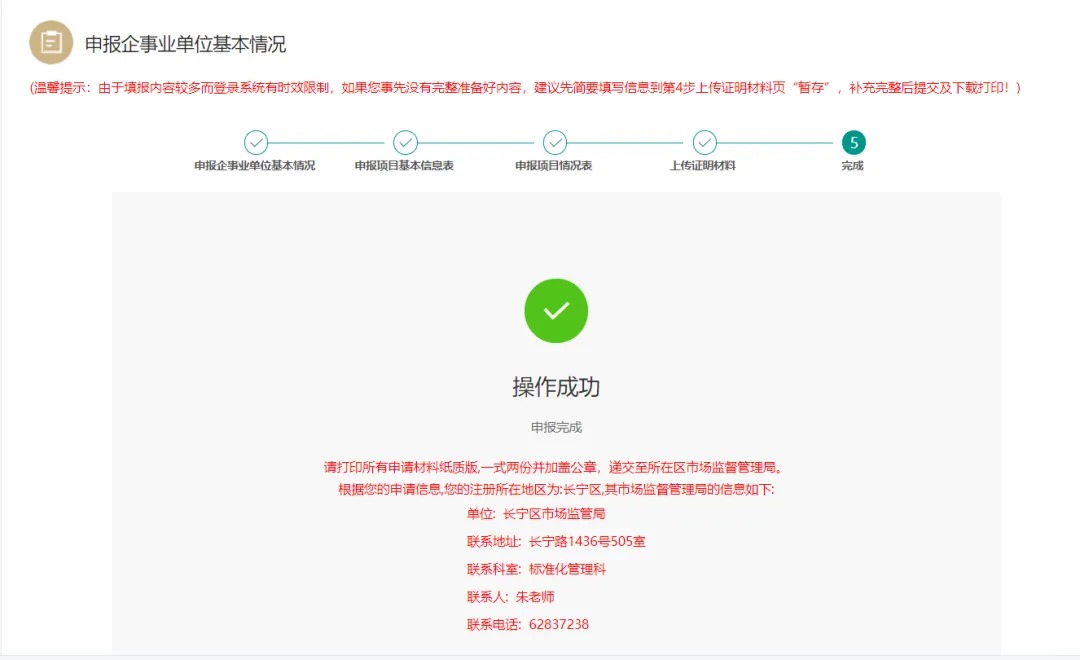 7.显示以下页面即完成项目填报。建议此界面截屏保存,以便及时联系所在区市场监管局。
