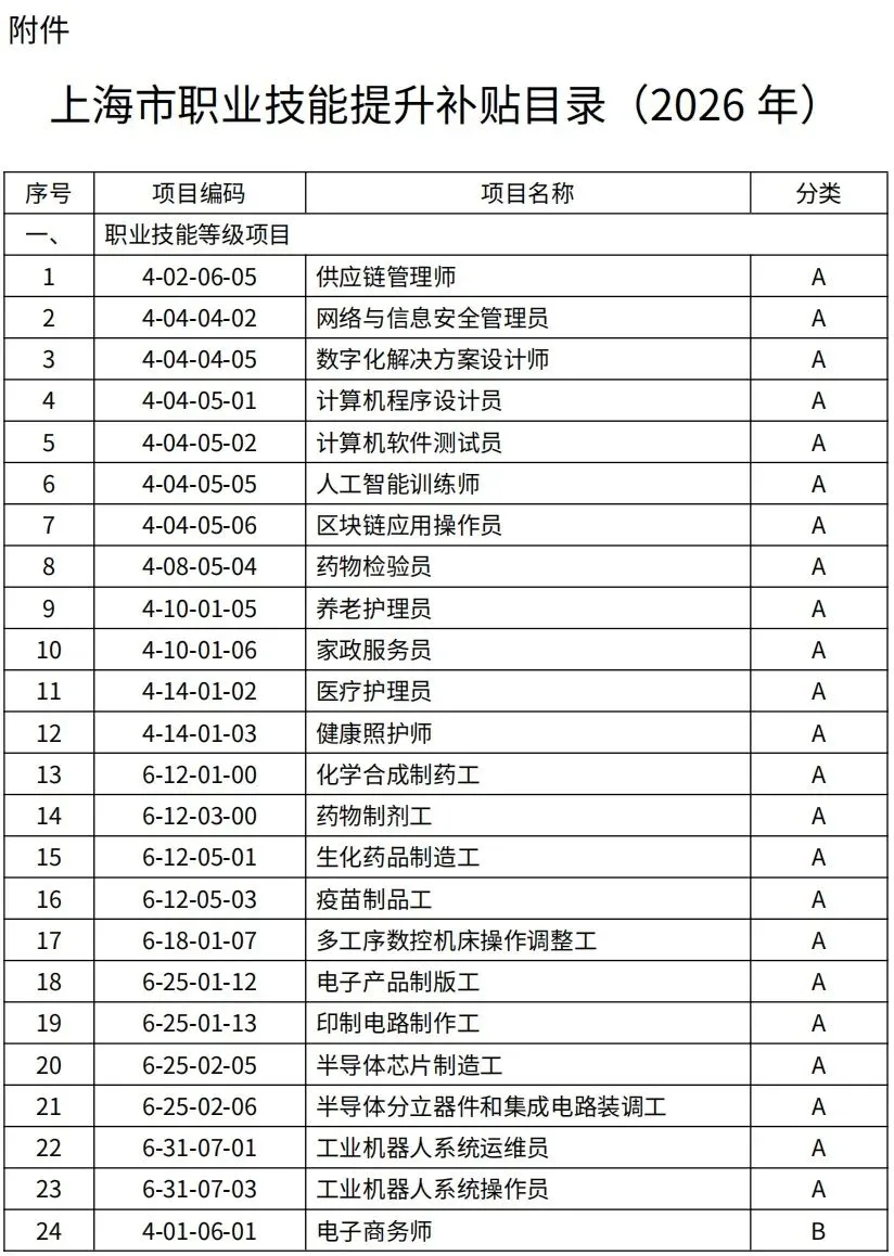 上海市职业技能提升补贴目录(2026年)自2026年3月1日起实施。