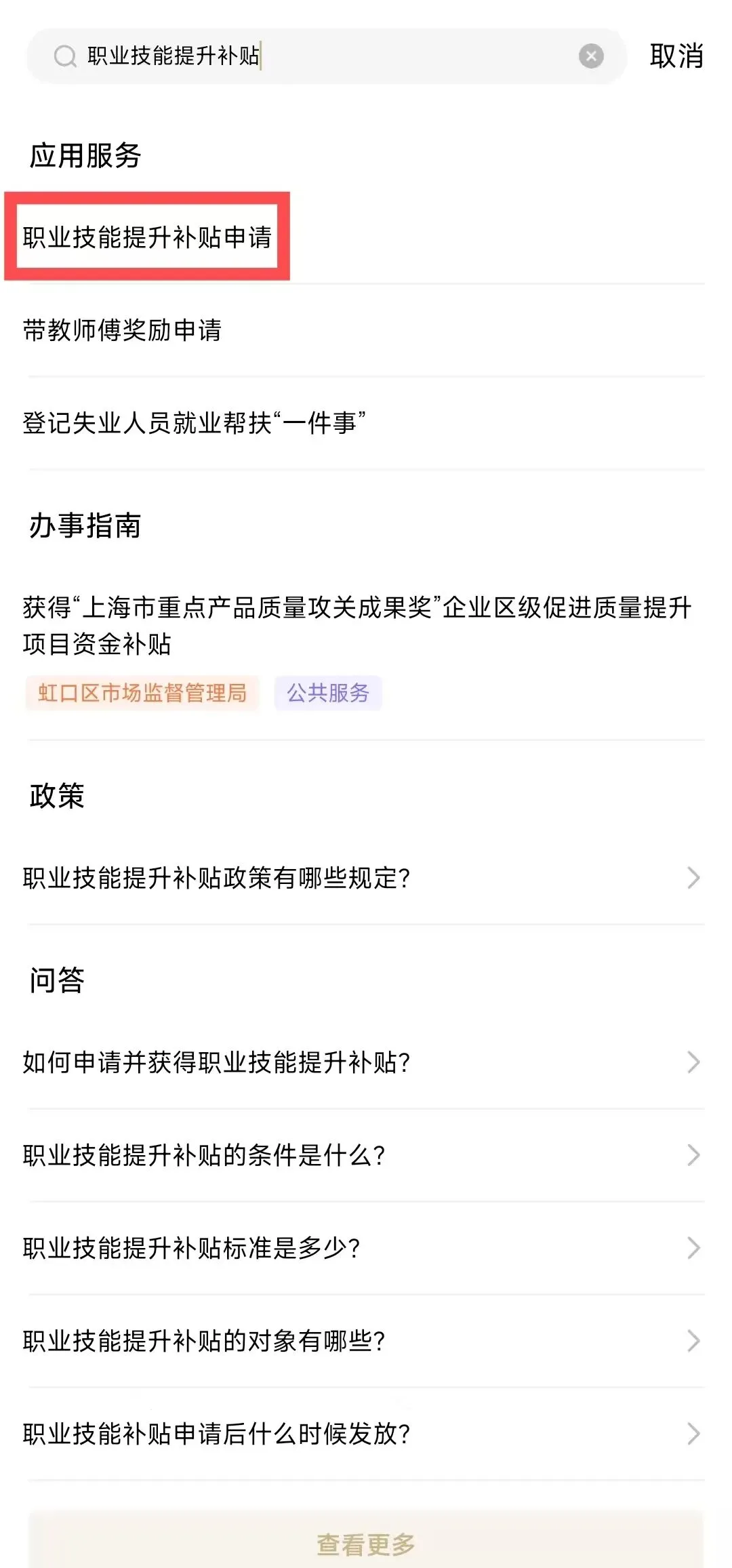 第一步:在“”(APP/微信小程序/支付宝小程序)首页搜索栏中输入“职业技能提升补贴”,在搜索结果中点击“应用服务”中的【职业技能提升补贴申请】事项进入申请界面。随申办市民云