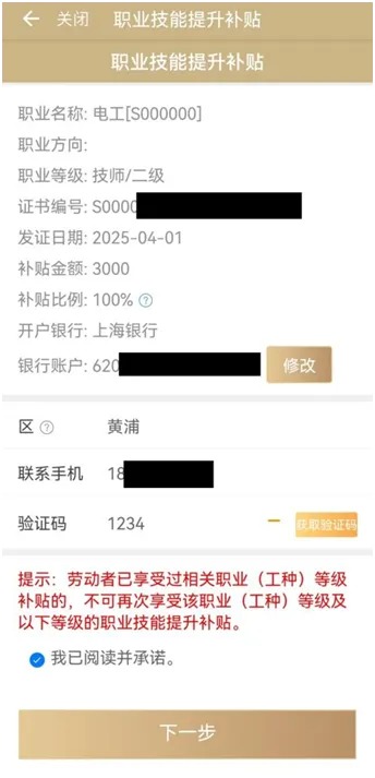 第二步:点击需要申请的证书信息,确认补贴金额、补贴比例及个人银行账户信息,如需修改银行账户信息,可点击【修改】按钮维护银行账户信息。